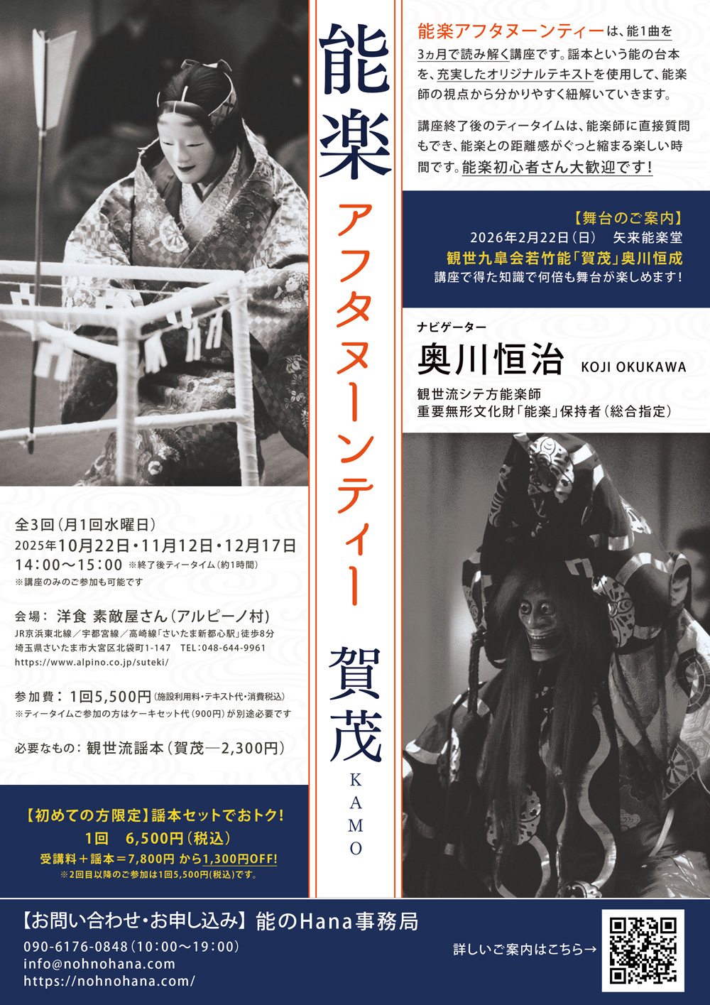 今回の曲「賀茂」は、2026年2月22日(日)に観世九皐会若竹能2月公演で上演される曲(シテ:奥川恒成)です。