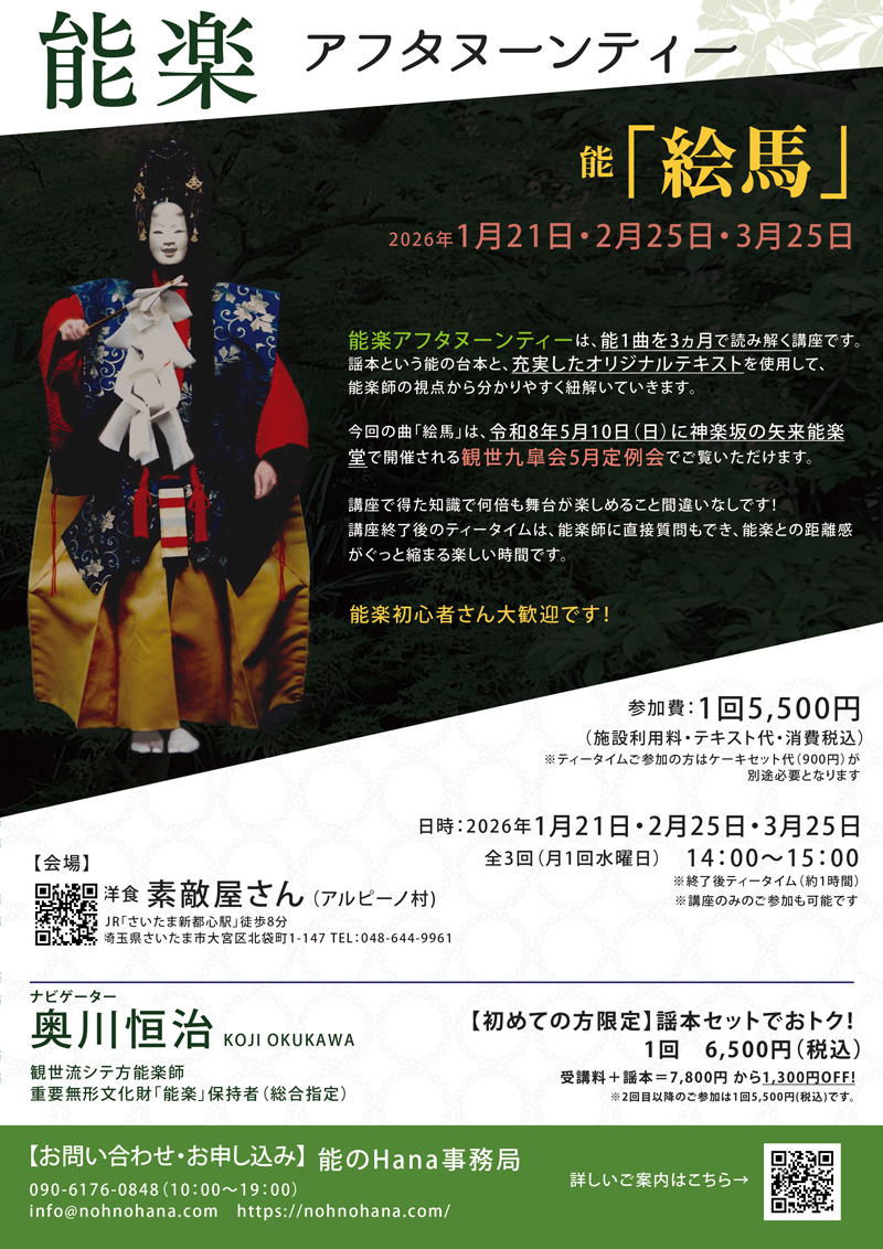 今回の曲「絵馬」は、2026年5月10日(日)に観世九皐会5月定例会で上演される曲(シテ:奥川恒治)です。